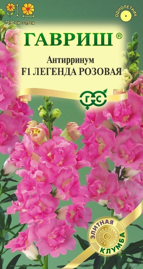 Элегантная, крупноцветковая серия «Легенда» является самой популярной и привлекательной среди других антирринумов. Высокие декоративные качества цветов, неприхотливость растений в уходе, обильное и продолжительное цветение — лучший выбор как для начинающих, так и для профессиональных садоводов. Растение однолетнее, высотой 70-90 см, с ярко-розовыми, махровыми цветами 3-3,5 см в диаметре. Длина кистевидных соцветий 10-15 см. Листья темно-зеленого цвета ланцетной формы. Растет на солнце и в полутени, предпочитает умеренный полив, холодостойко, к почвам нетребовательно, устойчиво к болезням и вредителям. Прекрасно подходит для любого ландшафтного дизайна. Хорошо сочетается с различными цветущими растениями в цветочных композициях на клумбах, в рабатках, бордюрах. Подходит для букетной срезки. Выращивают рассадным способом. Для получения дружных всходов семена необходимо стратифицировать при температуре +10°С. Посев проводят с начала марта до середины апреля, поверхностно, не заделывая, в ящики с субстратом и ставят на свет. Всходы появляются через 8-12 дней. Рассаду высаживают во второй половине мая с расстоянием между растениями 20 см.
