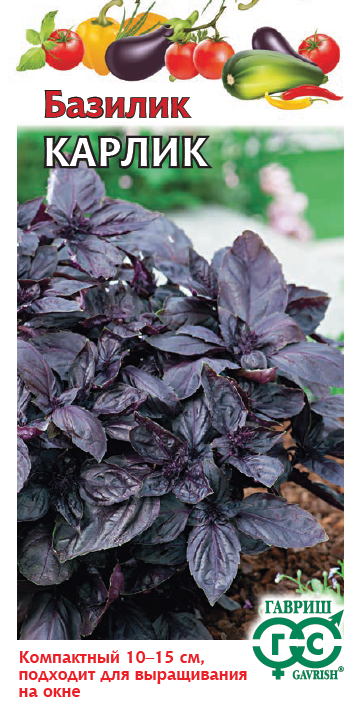 Компактное растение высотой 10-15 см. Идеально для выращивания в горшках на балконе и в комнатных условиях, в качестве декоративной и пряно-вкусовой культуры. Листья среднего размера, яйцевидные, темно-фиолетовые, ароматные, содержат много витаминов и минеральных веществ. Используют в качестве приправы к салатам, супам, гарнирам из овощей, хорошо сочетается с мясными и рыбными блюдами. Базилик обладает тонизирующими свойствами, улучшает пищеварение. Выращивается в рассадной и безрассадной культуре. Посев на рассаду производят в конце марта – начале апреля. Посев в грунт — в мае или начале июня. Высадка рассады в грунт – в начале июня. Схема посадки: 30x30 см. Предпочитает хорошо структурированные, богатые гумусом почвы. Нуждается в регулярных поливах.