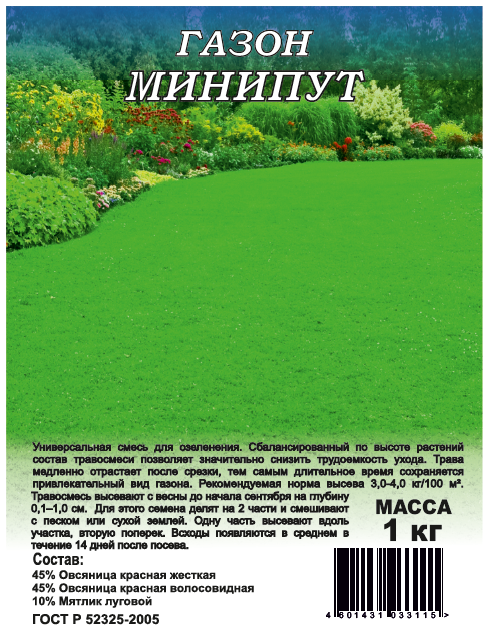 Газон Минипут (медленнорастущий) 1,0 кг (Festuca rubra L., Lolium perenne L., Festuca ovina L., Poa pratensis L.)