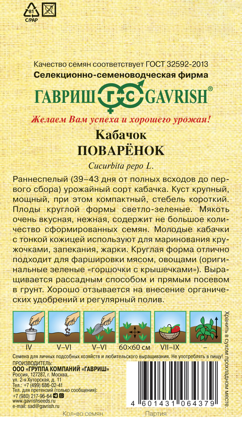 Раннеспелый (39-43 дня от полных всходов до первого сбора) урожайный сорт кабачка. Куст крупный, мощный, при этом компактный, стебель короткий. Плоды круглой формы светло-зеленые. Мякоть очень вкусная, нежная, содержит не большое количество сформированных семян. Молодые кабачки с тонкой кожицей используют для маринования кружочками, запекания, жарки. Круглая форма отлично подходит для фаршировки мясом, овощами (оригинальные зеленые «горшочки с крышечками»). Выращивается рассадным способом и прямым посевом в грунт. Хорошо отзывается на внесение органических удобрений и регулярный полив.