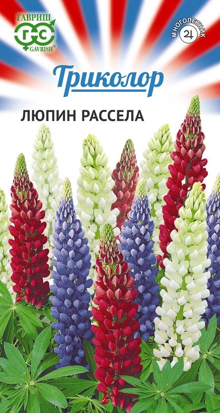 Многолетняя красивоцветущая смесь в бело-сине-красных оттенках флага России. Растения высокие (100 см), с вертикальными цветоносами, в нижней части украшены эффектными пальчатыми листьями. Соцветие–плотная, многоцветковая кисть длиной до45 см, с многочисленными душистыми цветками размером 2 см. Цветет с первых чисел июня в течение 30-40 дней. Люпин светолюбив, но выносит легкую полутень. Хорошо растет на любых нетяжелых почвах с рН 5,5-6,0. Семена высевают под зиму или ранней весной непосредственно в грунт. Смесь эффектно смотрится в посадках большими массивами на дальнем плане или на газонах перед живой изгородью.