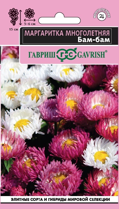 Нежные цветы маргаритки выглядят как маленькие солнышки, рассыпанные по клумбе и украшающие сад своим сказочным цветением с ранней весны до поздней осени. «Бам-бам» — это новый уникальный сорт, с крупными, эффектными цветками разных оттенков насыщенного красного, белого, нежного розового с белыми лепестками по центру и ярко-солнечной серединкой, компактным кустиком и короткими прочными стеблями. Изящное растение холодостойко, любит свет и неприхотливо в уходе. Хорошо растет на любых почвах. Семена высевают в конце июня-начале июля поверхностно, слегка вдавливая в грунт, всходы появляются через 7-10 дней. Цветет в апреле-июле, при хорошем уходе цветение продолжается до осени с перерывом в жаркий период сезона. Этот миниатюрный и хрупкий цветок-жемчужина идеален для ваз и контейнеров, горшков, бордюров, миксбордеров и клумб, а также для балконов и террас.