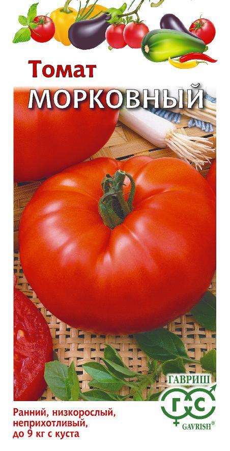 Раннеспелый (от всходов до плодоношения 85–100 дней) низкорослый сорт для выращивания в открытом грунте и пленочных теплицах. Растение детерминантное, высотой 80–90 см. Сильнорассеченные листья на кусте напоминают ботву моркови, отсюда и название. В кисти формируется по 6–7 оранжево-красных плоскоокруглых плодов массой 100–150 г. Мякоть сладковатая, сочная. Хороший салатный сорт, подходит для консервирования и засолки. Практически не поражается гнилью плодов. Урожайность до 6–9 кг с куста. Посев на рассаду в марте–начале апреля. Пикировка рассады в фазе первого настоящего листа. Посадка рассады в грунт — конец мая–начало июня. Растение требует умеренного пасынкования. Семена сохраняют всхожесть в течение 10 лет при оптимальных условиях хранения. Рекомендуется увеличить норму высева по окончании срока годности.